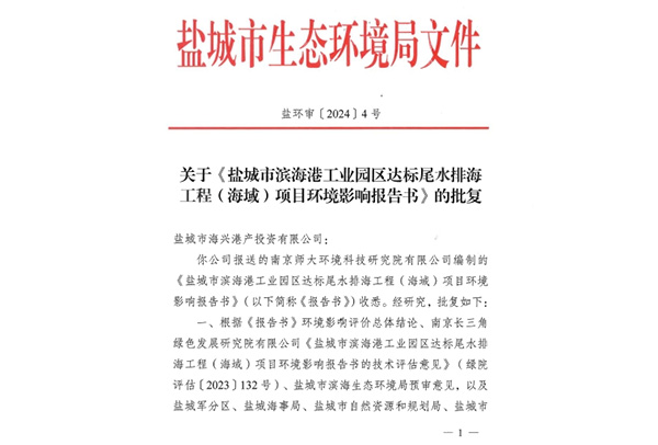 鹽城市濱海港工業(yè)園區(qū)達(dá)標(biāo)尾水排海工程(海域)項(xiàng)目取得環(huán)評(píng)批復(fù)