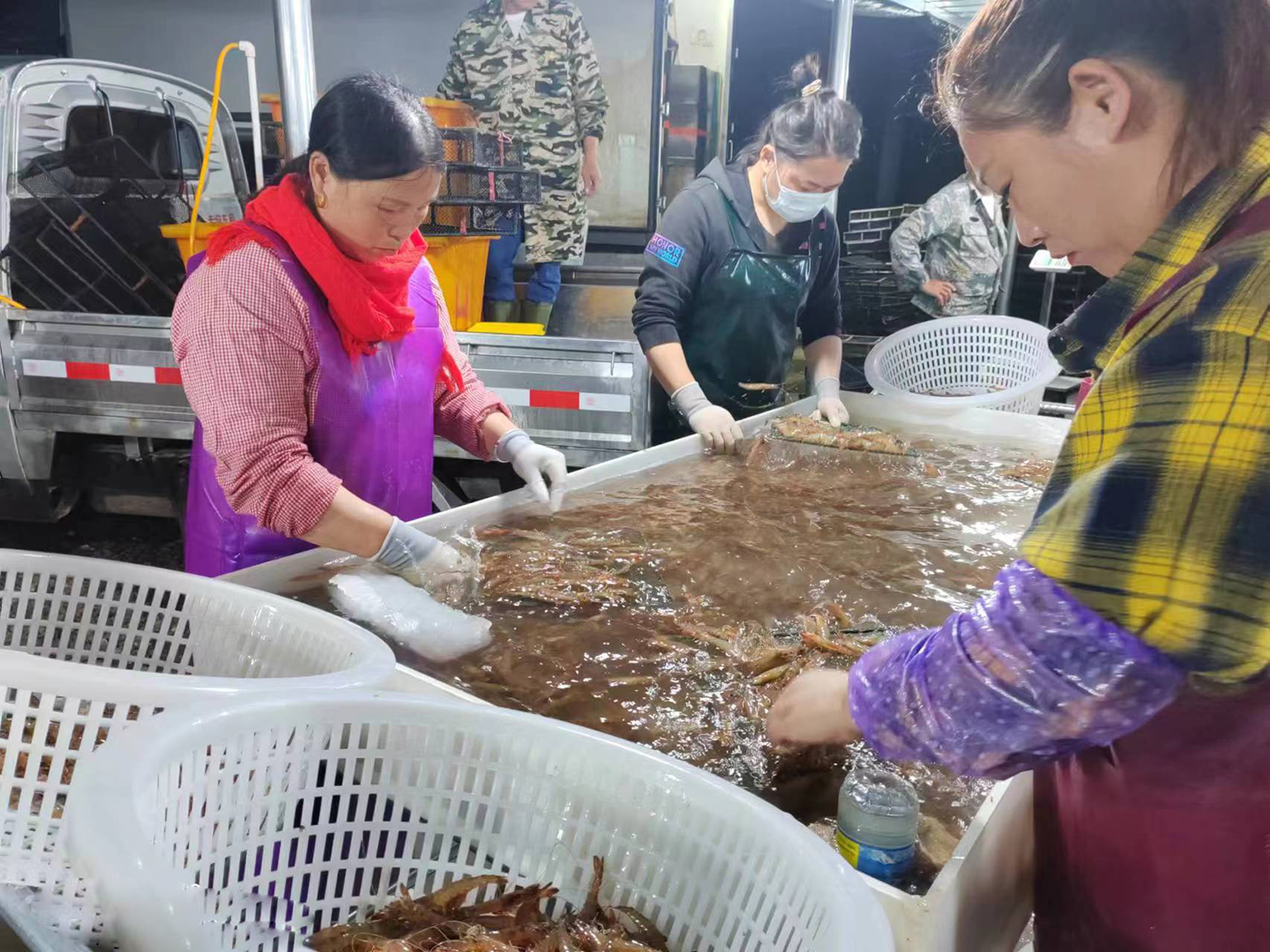 六月的初夏,灌東鹽場迎來了一年中第一波豐收季。在三圩養(yǎng)殖區(qū)的收購現(xiàn)場,忙碌的養(yǎng)殖戶將一筐又一筐的斑節(jié)蝦運送到集中收購點。夜幕下,工人們正熟練的分揀、打包。豐收的斑節(jié)蝦吸引了大批的客商前來收購,一筐筐剛上岸的蝦就被客商搶購一空,被運往全國各地市場進行銷售,2萬多畝的養(yǎng)殖塘口內(nèi)車水馬龍,一派繁忙景象。2023-06-21 -